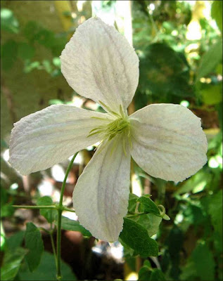 Clematis viticella 'Peveril Pristine' blüht von Juni bis August. Größe der Blüte 6 - 9 cm. Höhe 2,0 - 2,5 m, Schnittgruppe 3. Standort sonnig bis halbschattig. Absolut winterhart. Reichblühend.